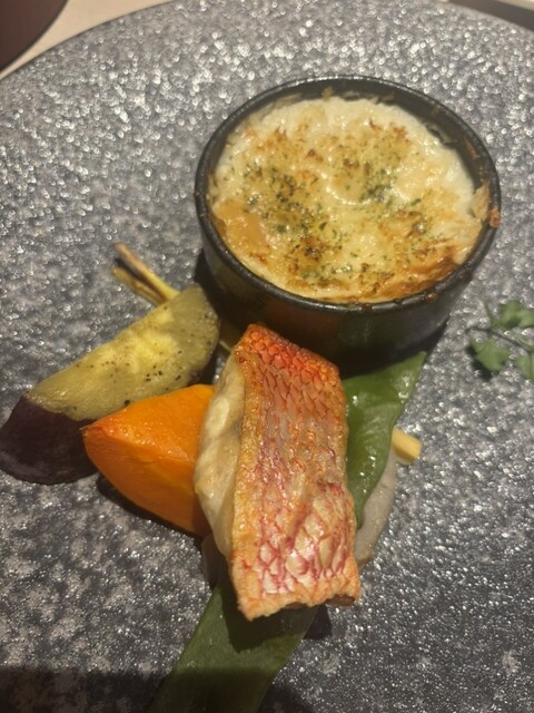 主菜:黒毛和牛肉と黒カリフラワーのアッシパルマンティエ”ハマ鯛のリテー