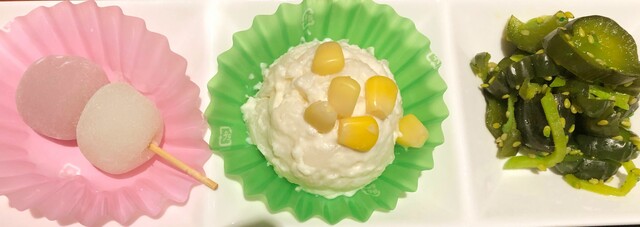 具沢山の味噌汁に、ポテサラ、お新香、デザートのお団子も付いています。