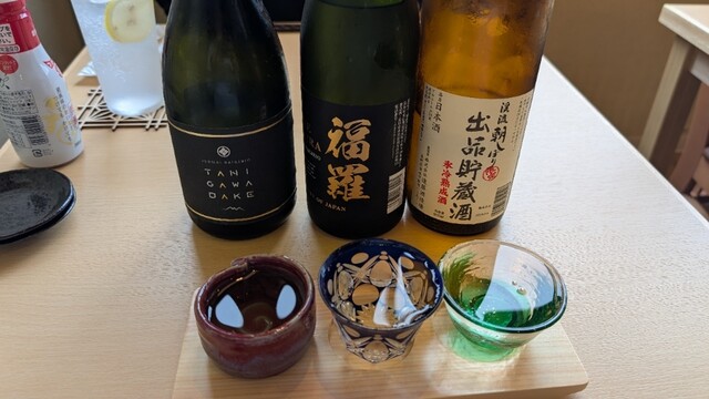 ほどなく、まずはかご盛りのおちょこからおすきな3つを選択します。ガラスや切子のさわやかな印象のものから、重厚な焼き物までバリュエーション豊富で悩んでしまいます。インスピレーション(というより多く入りそうな笑)で3つを選択。ほどなくお酒を3酒をお持ちいただき説明をいただきながら注いていただきます。こぼれる直前までなみなみとお注ぎいただき思わず顔がにやけます。注いでいただいたおちょこの後ろにボトルを並べていただきフォトセッション!地酒好きの気持ちをご理解いただいたホスピタリティ二重丸のサービス。もうすでにかなり満足です。
