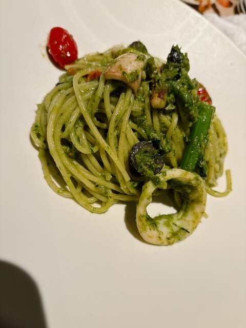 夕暮れ時に予約をしたので日が沈む所も見られて最高のロケーションでした。ブラッターチーズと桃はシャンパンにぴったりの組み合わせ。しらすのペペロンチーノも美味でした。