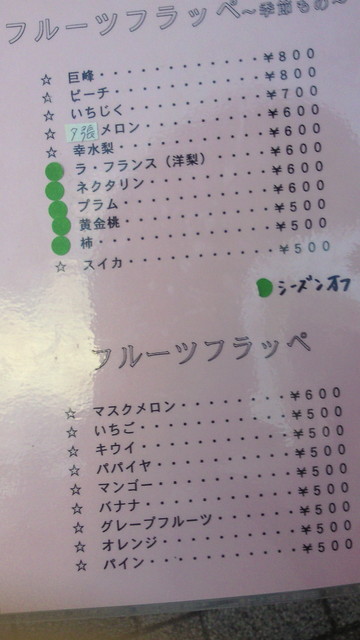 待ちの間に、メニューを渡されて、自分はいつも通りフルーツフラッペのピーチ(800円)と