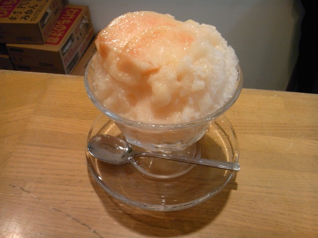 甘い白桃が3キレと小さく刻まれたものが氷の上にのっかってて、甘い白桃のシロップがかかっていて、