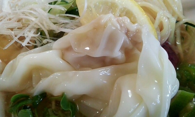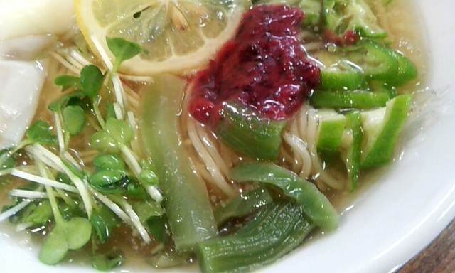 具材:名古屋コーチンの鶏ミンチワンタン3個、山クラゲ、キュウリ、オクラ、白髪ネギ、レモン、梅ペースト