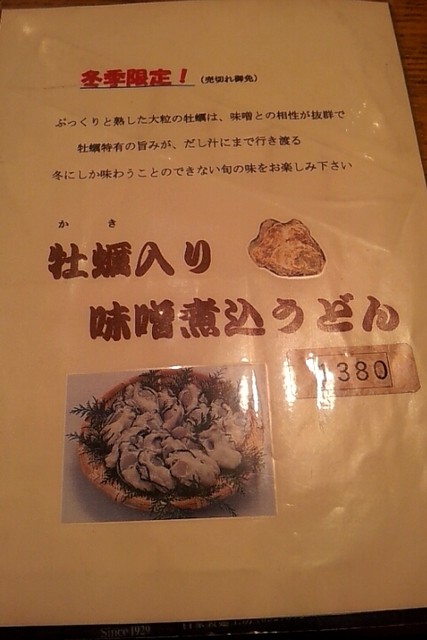 今回食したのは、「牡蠣入り味噌煮込み」!こちらは冬季限定メニューで1380円♪こちらの店では高めの