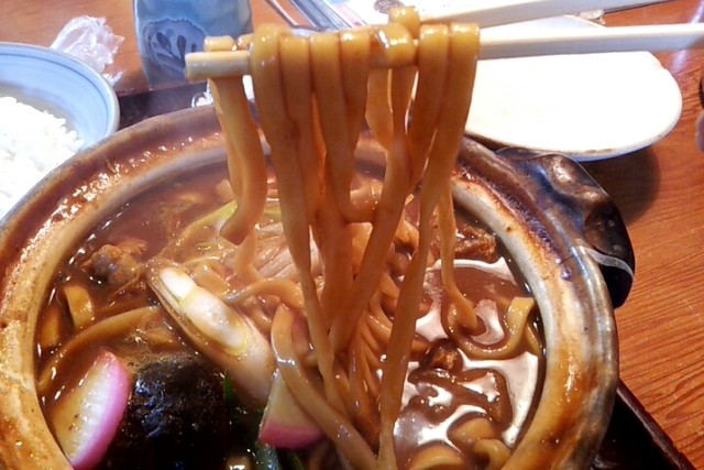 こちらは、うどんが若干やわめで、山本屋ほどのコシはないが、ここの汁にはこのやわめの平打ち麺が