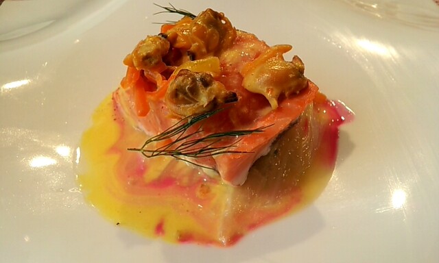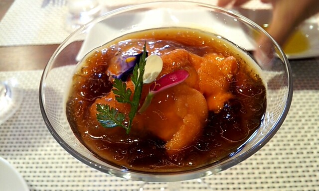 ■オマール海老のジュレとカリフラワーのムース、利尻産のウニ添え