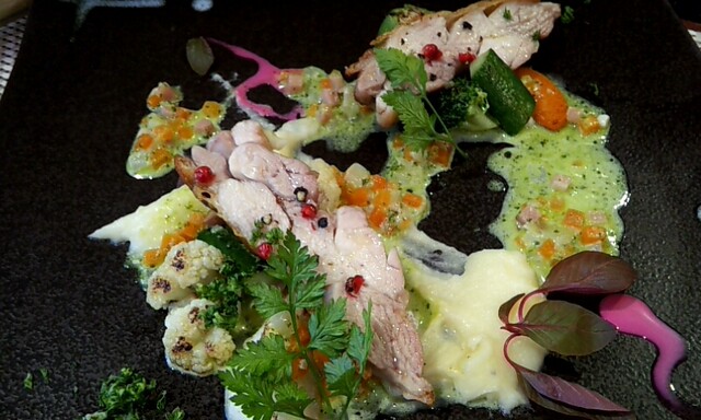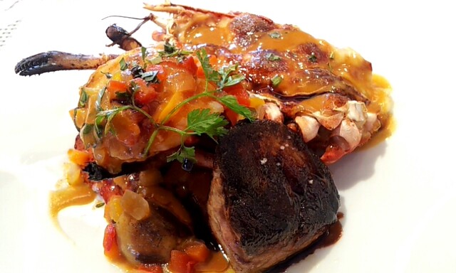 ■お魚料理:三河湾産スズキポワレ アメリケーヌソース 季節の野菜を添えて