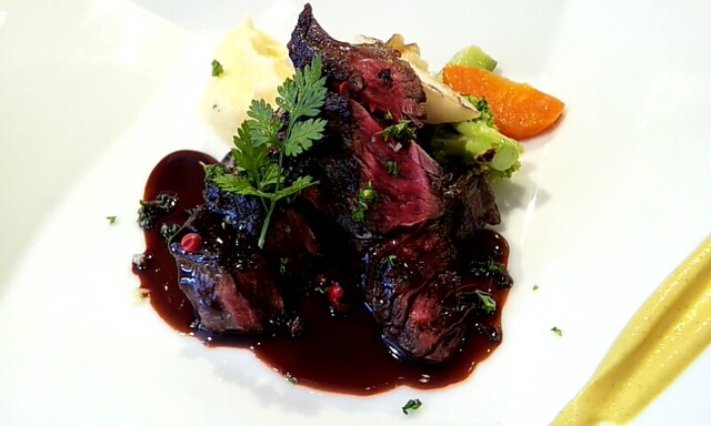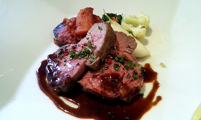 ■お肉料理:オーストラリア産牛肉のステーキ 赤ワインソース 季節の野菜を添えて
