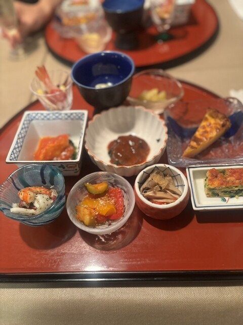 なんだか、店内は昭和の喫茶店のようなレトロな雰囲気。前菜のお膳:おせちのような和食のような器ですがイタリアン。一つ一つ丁寧な手作りでほんとにおいしい!選べるサラダはサーモンとチーズパスタ、パスタはエビとベーコンのトマトクリームパスタにしました。どれもほんとにおいしかったのでまた伺います