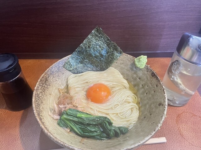 いつか行きたいと思っていて、念願叶いようやく訪問できました。平日開店10分前に到着で最初の方で入ることができました。相当運がいいと思いながら、食券機で醤油と、事前に調べていた二杯目限定なる釜玉を購入。着席してから5分ほどで到着。ミョウガに小松菜、鶏チャーシュー。薄く切られたロースのチャーシューにネギ、味玉そして大きな海苔のトッピング。ミョウガの赤と菜の緑、チャーシューのピンク。卵の黄色。見た目も色鮮やかで美しい外観にストレートの細麺に美しく透き通った醤油味のスープ。さっぱりかと思いきや煮干しもしっかり効いていて上品な味で麺との相性も抜群。無我夢中で食べ進め、あっという間にスープまで飲み干し、次は二杯目限定釜玉へ。一杯目は醤油だったので、釜玉は塩で注文しました。到着時に食べ方を店員さんが丁寧に教えてくれました。教えてもらった通りに早速底のタレと麺を絡める。美しく整えられた細麺に小松菜?にかつお節、中央に乗せられた卵の黄身、そして海苔、ワサビ。底のタレもしっかり味がある中で卵の黄身も濃厚で、味変する間に食べ終わってしまいそうでしたが、煮干し入りの酢を足してみることに。すると先程とは打って変わってあっさり。わさびを混ぜると締めの最後にふさわしい爽やかな味に。二杯目にも関わらず三杯目も行きたいくらい口の中がさっぱりしました。二杯目限定というシステムもさることながら、訪問したら絶対食べてほしいと思える一杯(二杯)でした。