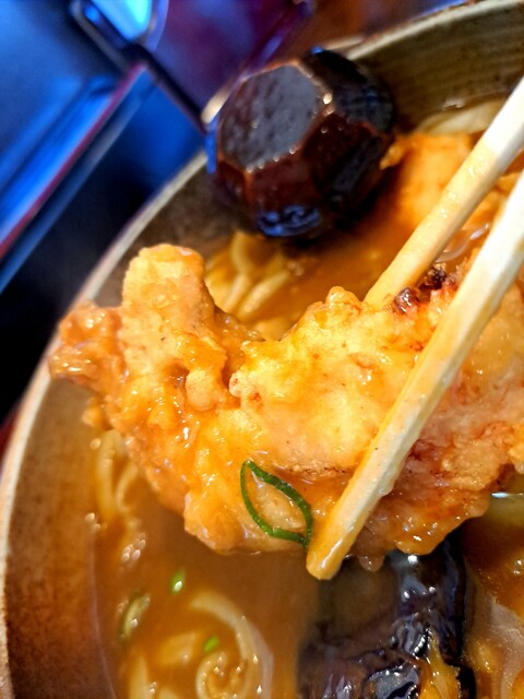 ・鶏天となす天のカレーうどん…デカい麺鉢になみなみと