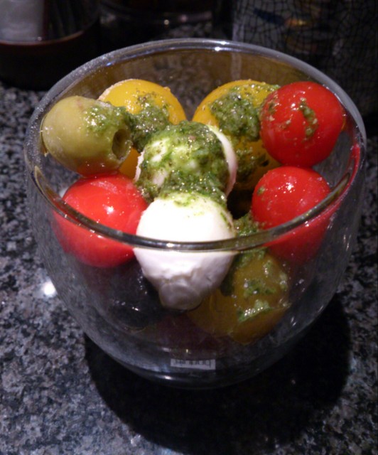 フルーツトマト、オリーブとモツァレラチーズのジェノベーゼソースかけ、シャルドネとの相性ピッタリ