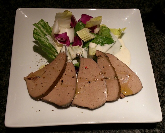 リヨン風サラダ、豚バラを白ワインで蒸したものを焼いてからバルサミコソースをかけたもの、奥は鶏レバー