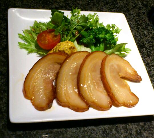 これは、豚の三枚ばら肉を白ワインで蒸したものをスライスし、注文が入ってからフライパンで焼いて