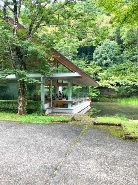 静かな緑と、水芭蕉の咲く水上に浮かび上がる別荘風のレストラン。