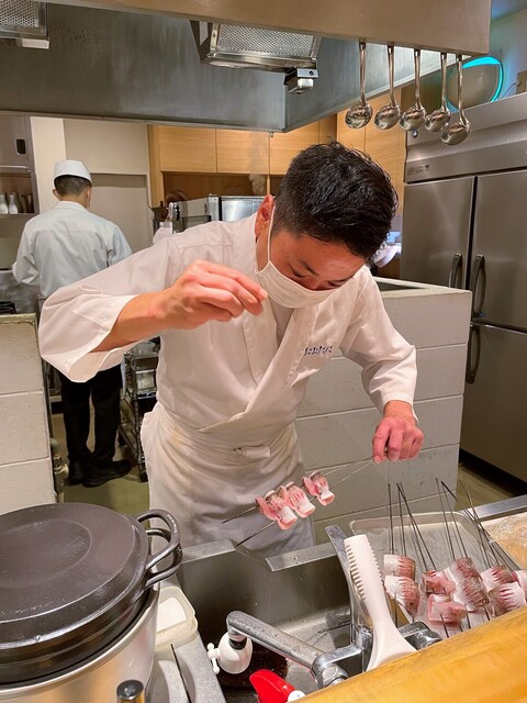 一つ一つの料理の仕上げ、真剣なまなざしで食材を盛り付けてゆく店主。