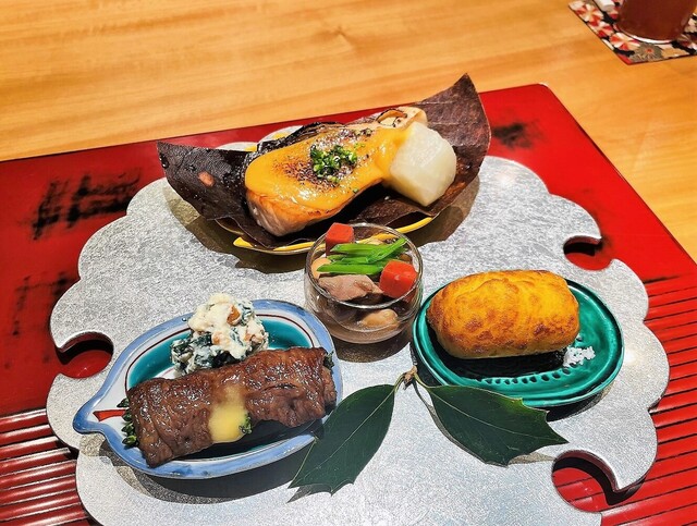 真鯛の飯蒸し、馬鈴薯、蕪、だし巻き玉子