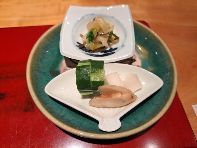 香の物 きゅうり糠漬け・かりもりの西京味噌漬け・みょうがの甘酢漬け・コリンキーの浅漬け・夏蛸の柔らか煮・小松葉のおひたし