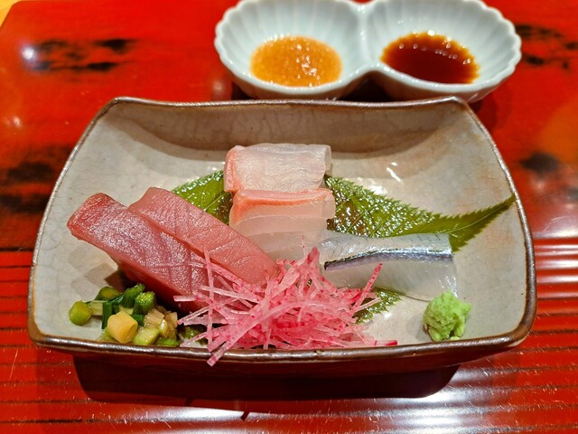 造り まぐろのお造り たたき長芋の山かけ、とろみ醤油で