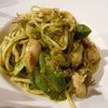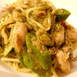 ヒイカのパスタ ジョノヴェーゼ,烏賊はけっこう仕込みや火入れが難しい素材ですが,パスタの茹で加減を含め完璧に提供しています。オクラと鷹の爪も入っています。オリーブオイルとフレッシュバジルの香りが何とも良い感じです。鷹の爪がいいアクセントになっています。