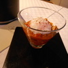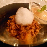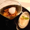 タルトタタンとヘーゼルナッツのアイスクリーム。タルトタタンはびっくりしました。スクラップアンドビルド的と申しましょうか。ヘーゼルナッツのアイスクリームも良いのですが,両方の合わせたハーモニーもいいと思います。ちなみにタルトタタンにのっている泡状はバルサミコです。ランチ時のデゼールよりいいですね~。