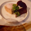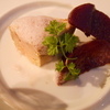 フォアグラのテリーヌ 桃のコンポート添え 赤ワインヴィネガーソースを添えて。フォアグラのテリーヌは半分ほど食べた後に写真アップしていますのであしからず・・・・・・・・・。
