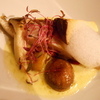 カンパチの香草バターソース,低温調理したカンパチを白ワイン・バター・エストラゴン・イタリアンパセリのヴァンブランソースで仕上げています。付け合わせはインカのめざめのじゃがいも・エリンギ・椎茸・ドライフルーツトマトです。これはクラッシクなラインのソースですが,酸味も感じるとてもいいソースです。低温調理でカンパチの旨みがとても引き立っています。