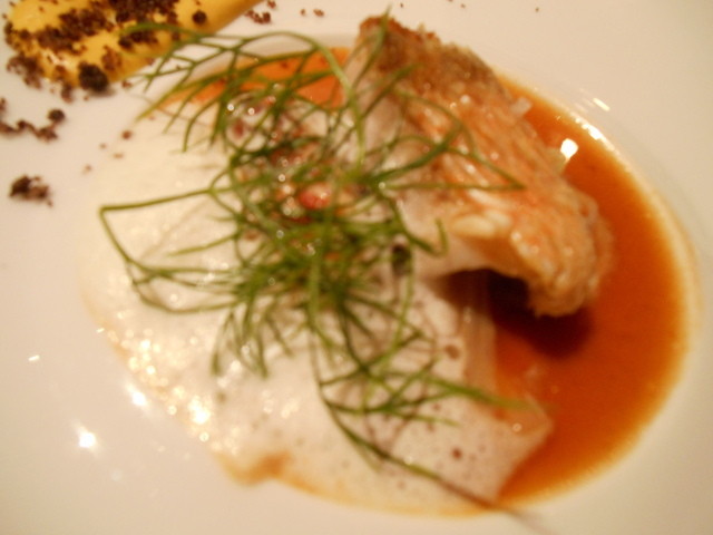 甘鯛とオマールエビのブーダン,甘鯛はうろこごと揚げています。ラ・ベを彷彿します。オマールのブーダンは優しさを醸し出しています。ソースはビスク的なものでした。ソースは優しいのですが,しっかりと輪郭がありますね。