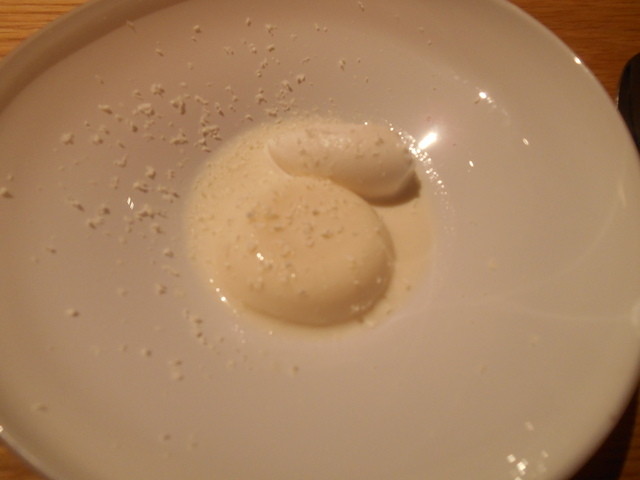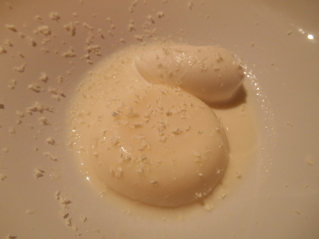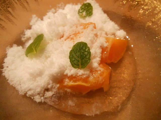 デゼールは みかんとヨーグルトのパウダー ベルベーヌ風味,メレンゲのブランマンジェ 苺アマンド です。どちらも雪を見立てています。苺アマンドは苺の色を牛乳に漬け込み,色を抜いていますが,ビックリしてしまいました。