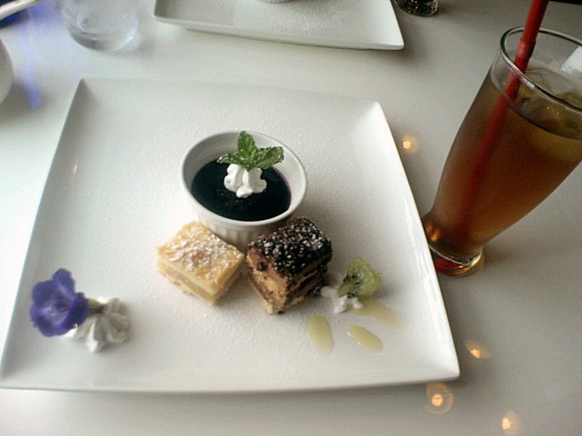 デザートは、ブルーベリーゼリー、アップルパイ、チョコレートケーキの三種盛り。