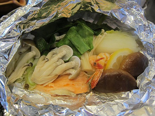 選択料理は、「野菜とシーフードのホイル包み焼き」+「鶏スナズリのソテー黒コショウ風味」で。