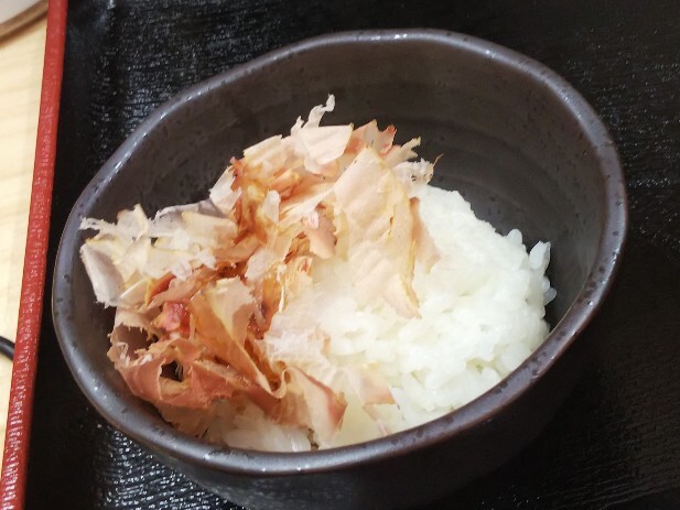 加えて、セットの白ごはんは、カウンターに用意された、荒削りの鰹節と専用醤油で