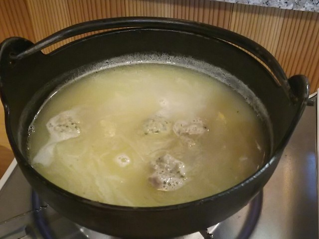 しゃぶしゃぶ用に味を整えた水炊きスープに、刺身でも頂ける、新鮮な秋田比内地鶏をシャブシャブと潜らせると、炙りとはまだ、ヒトアジ違う比内地鶏の豊かな甘味♪