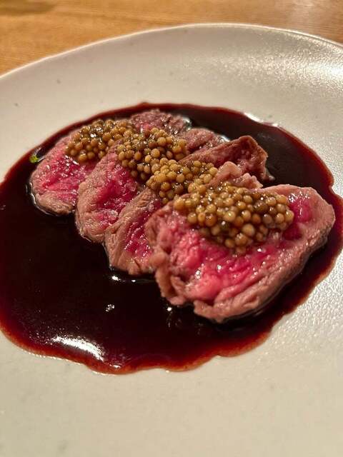 しっとり柔らかな火入れに粒マスタードにしっかりソース・肉料理にはやっぱり赤ワインがよく合うよね