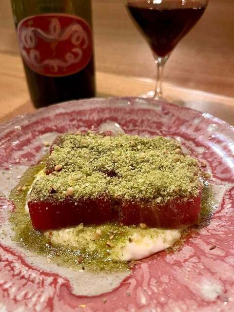マグロの上にはナッツとコリアンダーやレモンの皮が敷き詰められて・ナッツの食感やスパイスの風味が口の中に広がる一皿ですよ