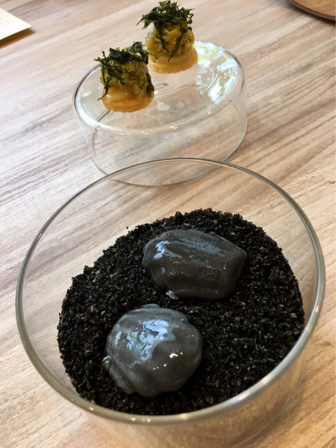 アミューズの北海道帆立は竹炭を練りこんだコーンの中に茄子のピューレやマチルダトマトと共に潜んでいるのでゆっくり味わってみて