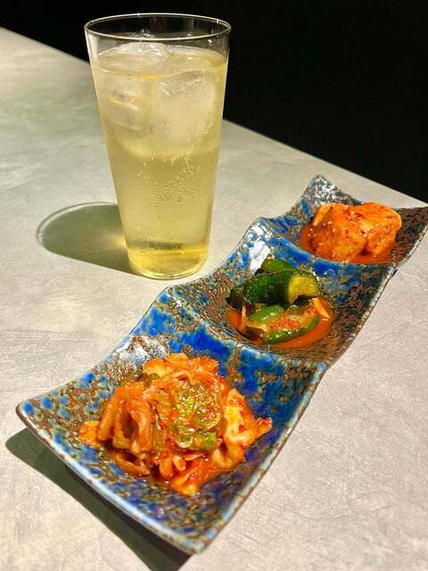キムチは白菜・胡瓜・山芋の3種・角ハイボールで喉を潤しながらつまみにパクり