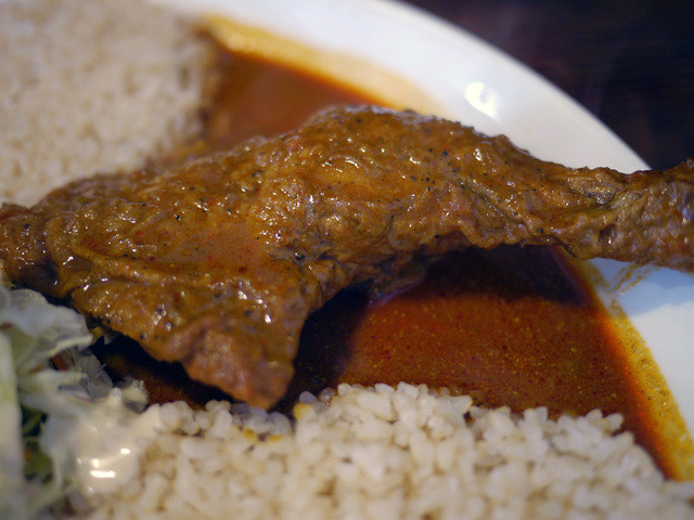 ○ インド風イエローカリー ~ 大きな骨付きチキンが印象的なこのお店で一番辛い奴です~☆ チキンめっちゃ柔らかくスプーンを入れると骨からほろりとはがれます~☆ 結構辛めですね~☆( 個人的にはもうちょい辛くても良いかなって思いますが~☆ )