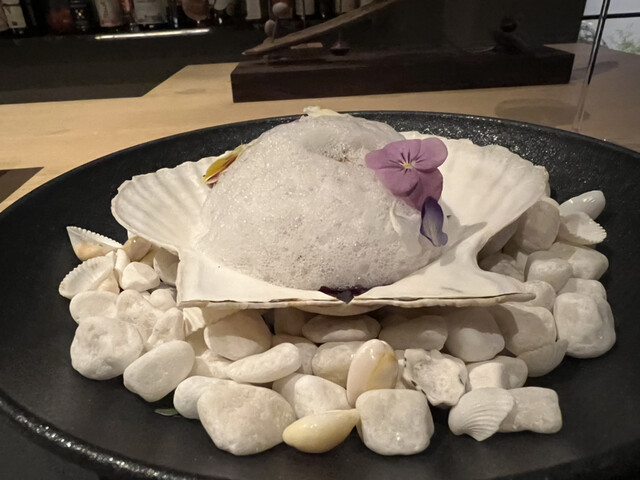 →筍とホタテのスプーマ仕立てになっていてホタテ貝の肝のソースでいただきます