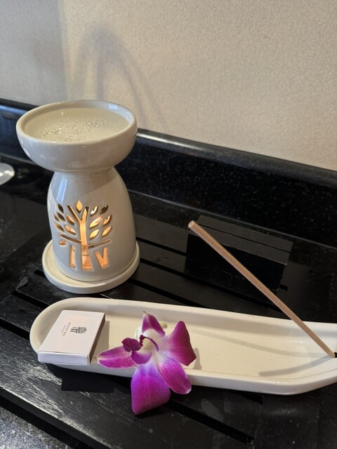夜お部屋に戻ると軽いベッドメイキングされ、アロマの補充とミネラルウォーター、ベッドの上に亀のぬいぐるみ(1泊目)、アロマグッズ(2日目)の癒しグッズのプレゼントがあります