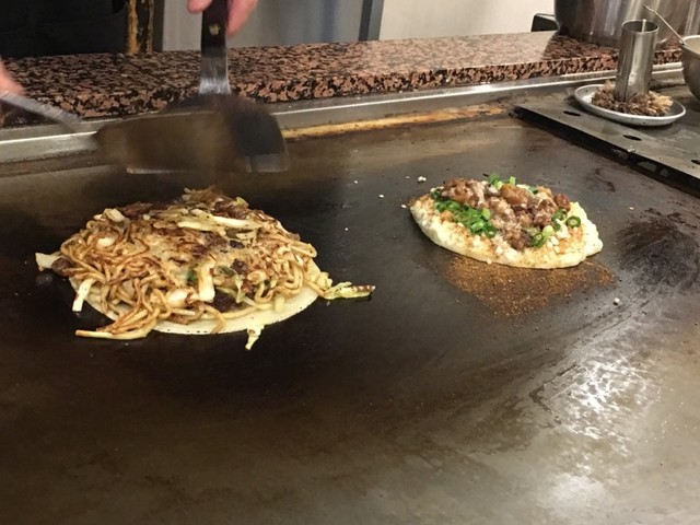お好み焼き、そば焼き、うどん焼きがメインです。鉄板焼きのおつまみも色々とあります。