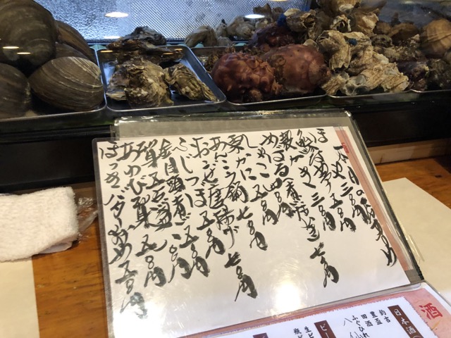 手書きの本日のおすすめにレギュラーメニュー。ネタケースには見るからに新鮮そうな色々な貝類、甲殻類、魚が並びます。
