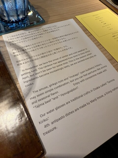 ペアリングは、ワインだけでなく日本酒もありました。どれも料理にぴったりで料理を引き立てるものばかりでした。スタッフも皆さん親切でリラックスして過ごすことができました。