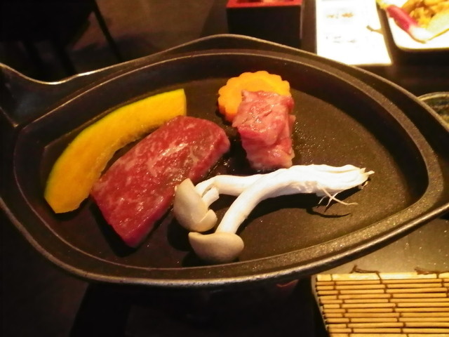 中盤、陶板焼きに火が入り、柔らかく美味しい牛肉や野菜をいただく。