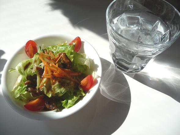前菜は、アンチョビソース乗せのポークと、サラダ。