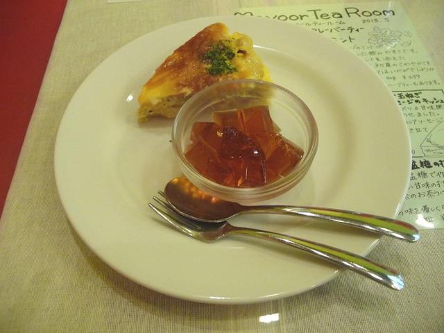 出てきたら、 キッシュに、茶色いゼリーが添えられています。