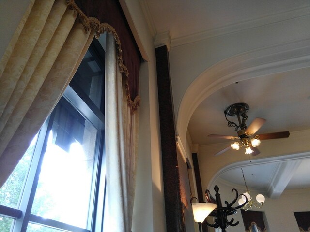 見上げると、 古くて素敵な照明が 窓から見えます。