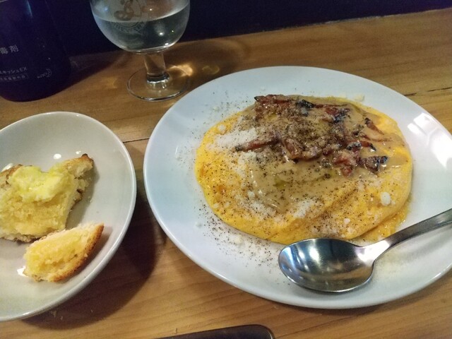 オムレツの上にカルボナーラソースがかかっているもの。塩分濃いめで私は好き。薄味が好きな人には不向き。