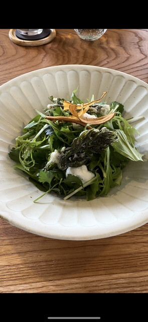 (桃蕪、新玉ねぎ、スナップエンドウ、蕗、ブロッコリーの脇芽、こごみ、紅菜苔、ごぼう、タラの芽、クレソン、ミツバ、水菜、ルッコラの蕾、春菊、フリルレタス、ハコベ、わさび菜、イタリアンパセリ)