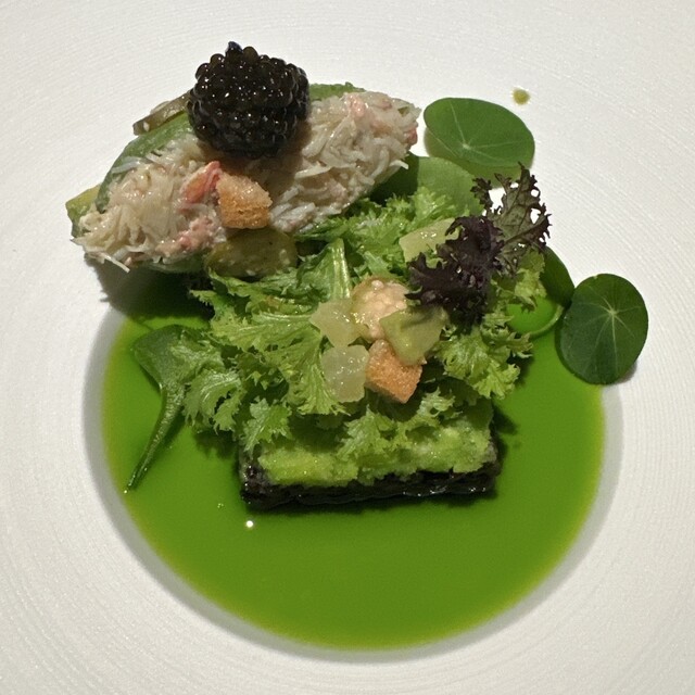 なかでも黒米を基礎に旬の食材〜加能がにをアレンジ、薄い豆やアボカドを重ねナスタチウムを散りばめ、濃淡の違う緑色が輝きを放つ‼️